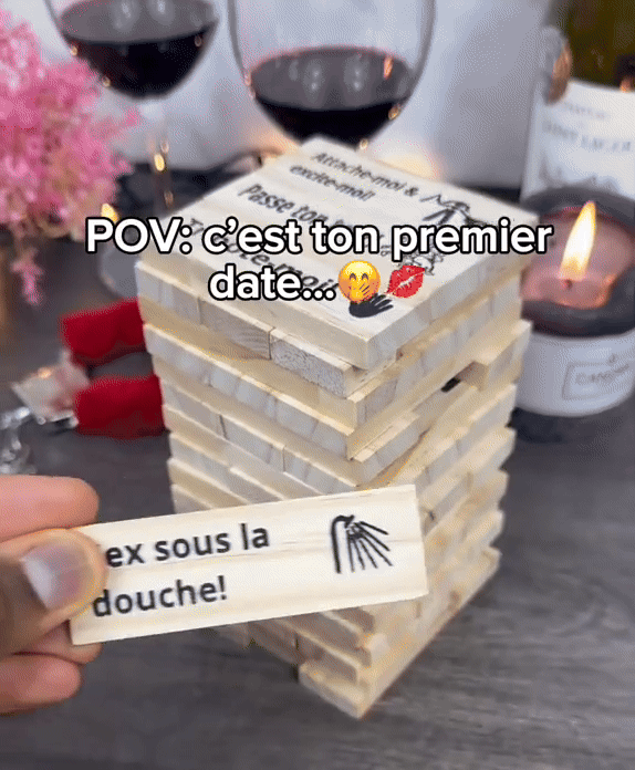 Avec notre jeu de blocs amusant et coquin ! Chaque bloc propose un défi espiègle pour vous rapprocher de votre partenaire. Idéal pour les soirées en amoureux ou simplement pour passer un bon moment ensemble. Pimentez les choses et découvrez de nouvelles façons de vous connecter à chaque mouvement !